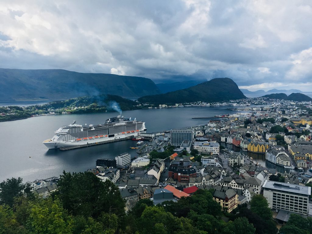 Looking out from the cruise ship from the top outdoor decks was lovely. We could not get enough of the beautiful views of the city, the lush green mountainous landscape around us. Alesund is a city as part of an archipelago so everything revolves around the water.