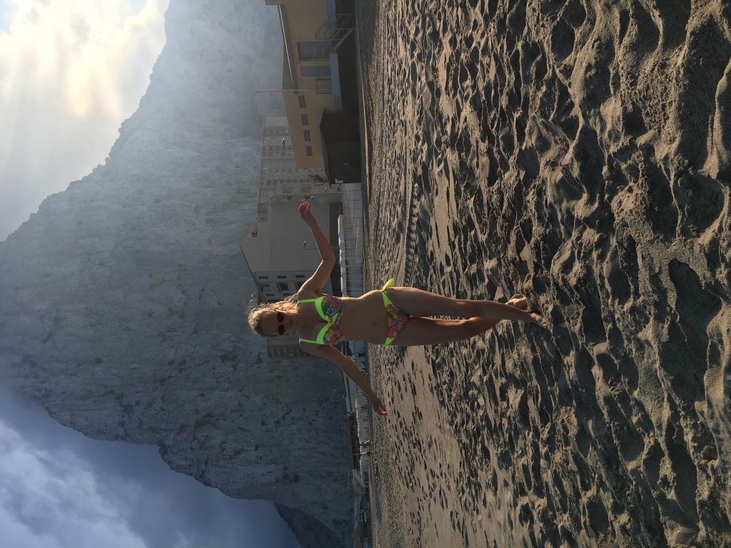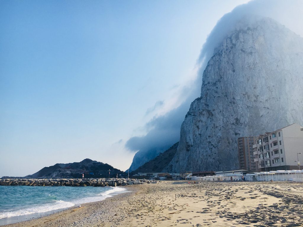 We walked from the terminal into town to the main center, surrounded by local vegetation and loads of British pubs. From there we took a taxi to eastern beach, an incredible narrow beach with soft white sand, warm blue ocean waters and giant sea shells right at the foot of the Rock of Gibraltar. It was one of the most unique and fascinating beaches I had ever seen. The image of the rock of Gibraltar right in front of us was incredibly imposing. The top part of the rock had a constant stream of clouds passing around it in an eerie and other worldly way. It was a sight to behold.